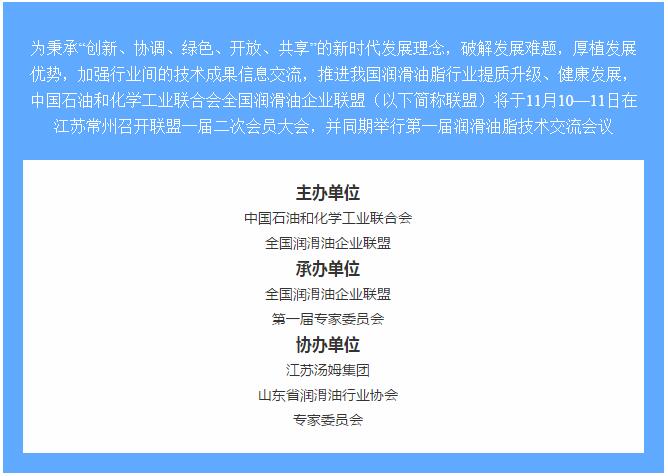 會議邀請丨江蘇湯姆集團(tuán)協(xié)辦全國潤滑油企業(yè)聯(lián)盟一屆二次會員大會暨 第一屆潤滑油脂技術(shù)交流會